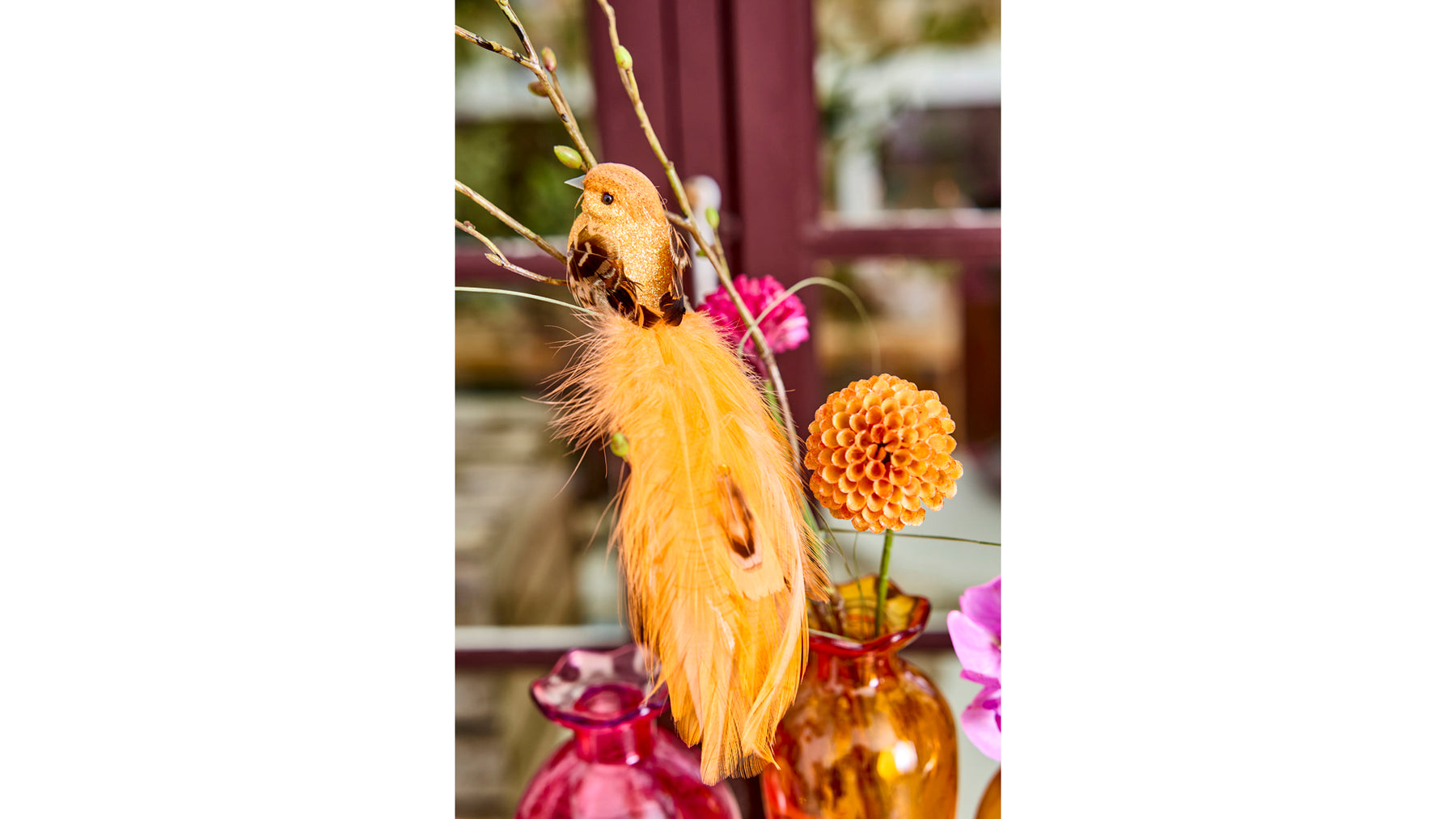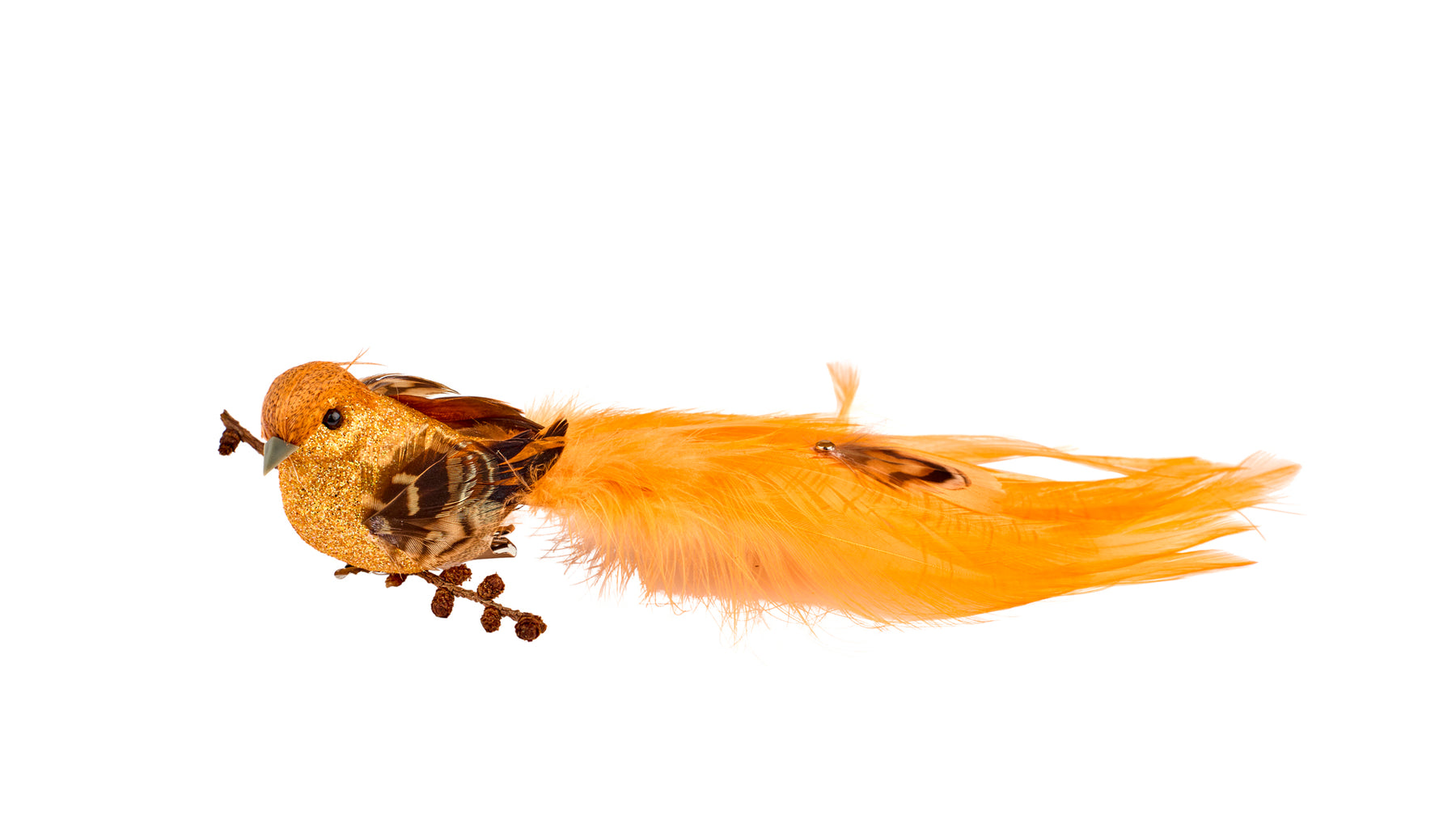 Skab liv og farve i din indretning med denne dekorative fugl med clips i smukt orange glitter. Fuglen har et legende og dekorativt udtryk, der tilfører et strejf af glimmer og personlighed.