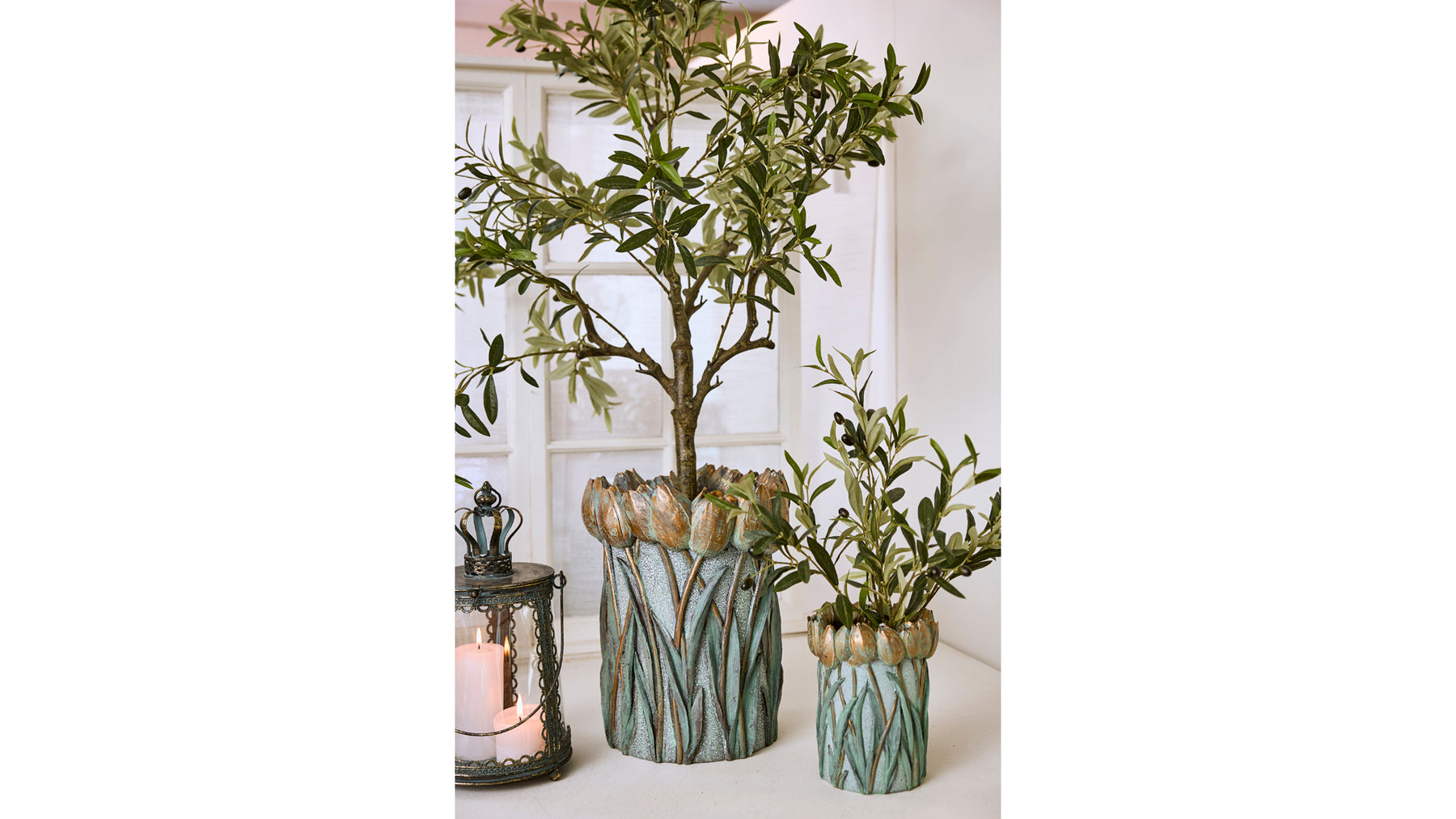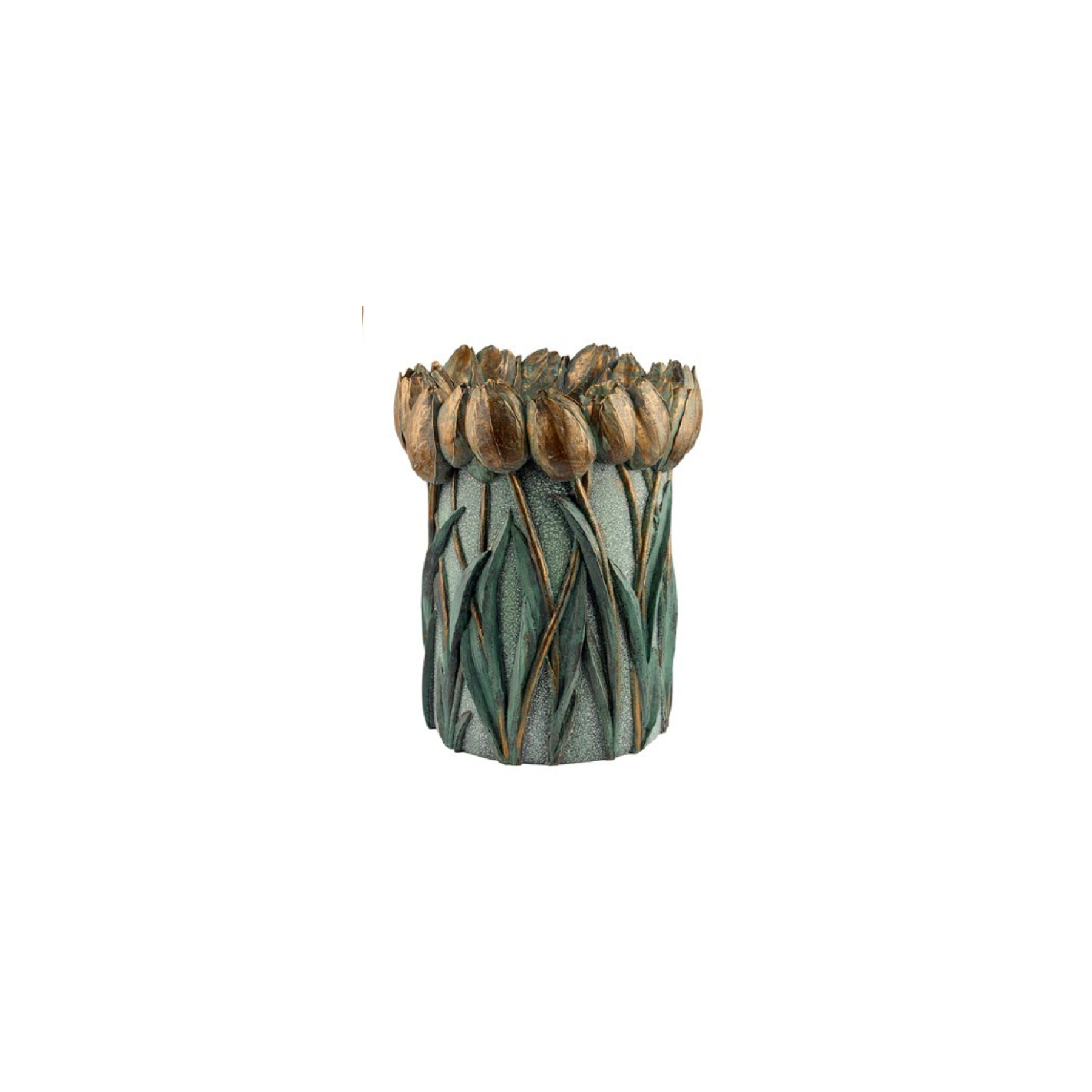 Tilføj et elegant og naturinspireret element til din indretning med denne smukke Tulip potte. Potten er udsmykket med fine tulipaner og har en flot irgrøn finish, som giver et klassisk og let patineret udtryk.