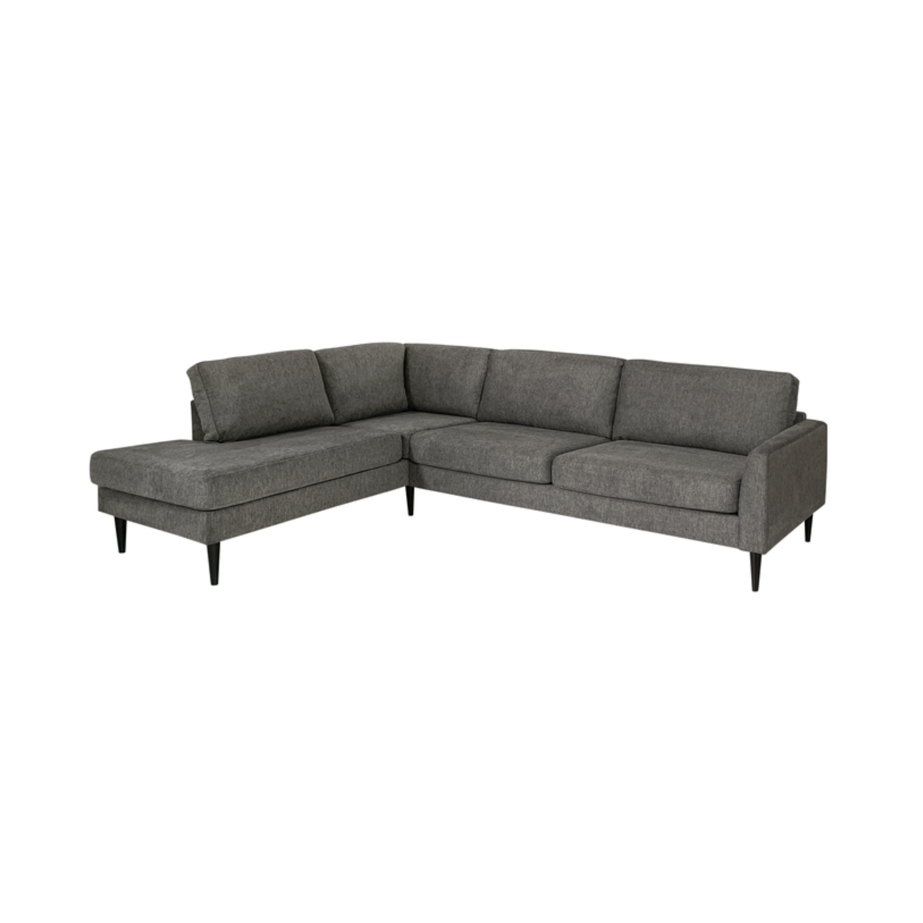 Klein hjørnesofaen med open end er monteret med kraftigt medium gråt møbelstof, der giver et roligt og indbydende udtryk og er velegnet til hverdagsbrug.