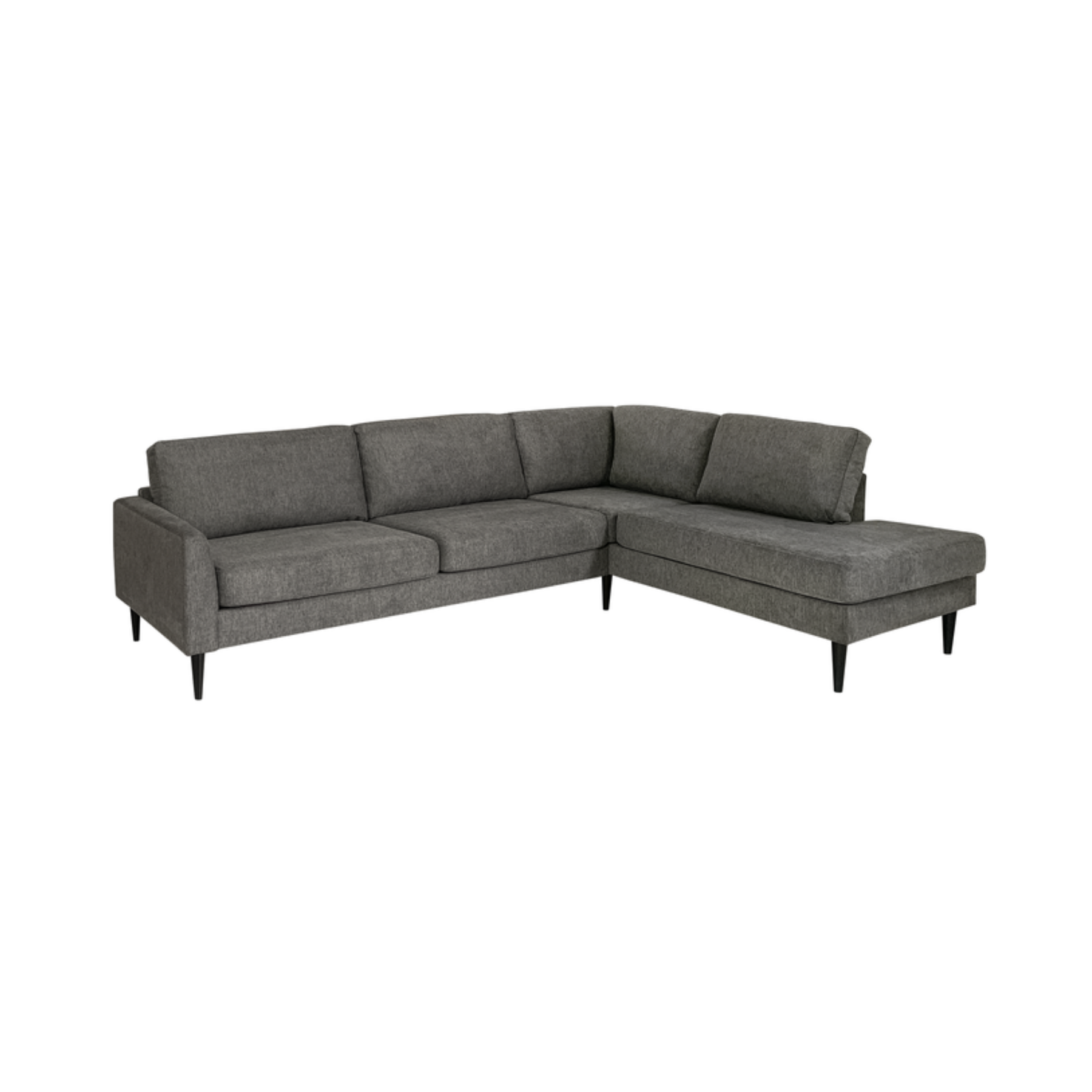 Sæderne er opbygget med koldskum, som sikrer god støtte og lang holdbarhed. De sorte træben tilfører sofaen et elegant og moderne look, mens open end-delen giver ekstra plads til afslapning og komfort.