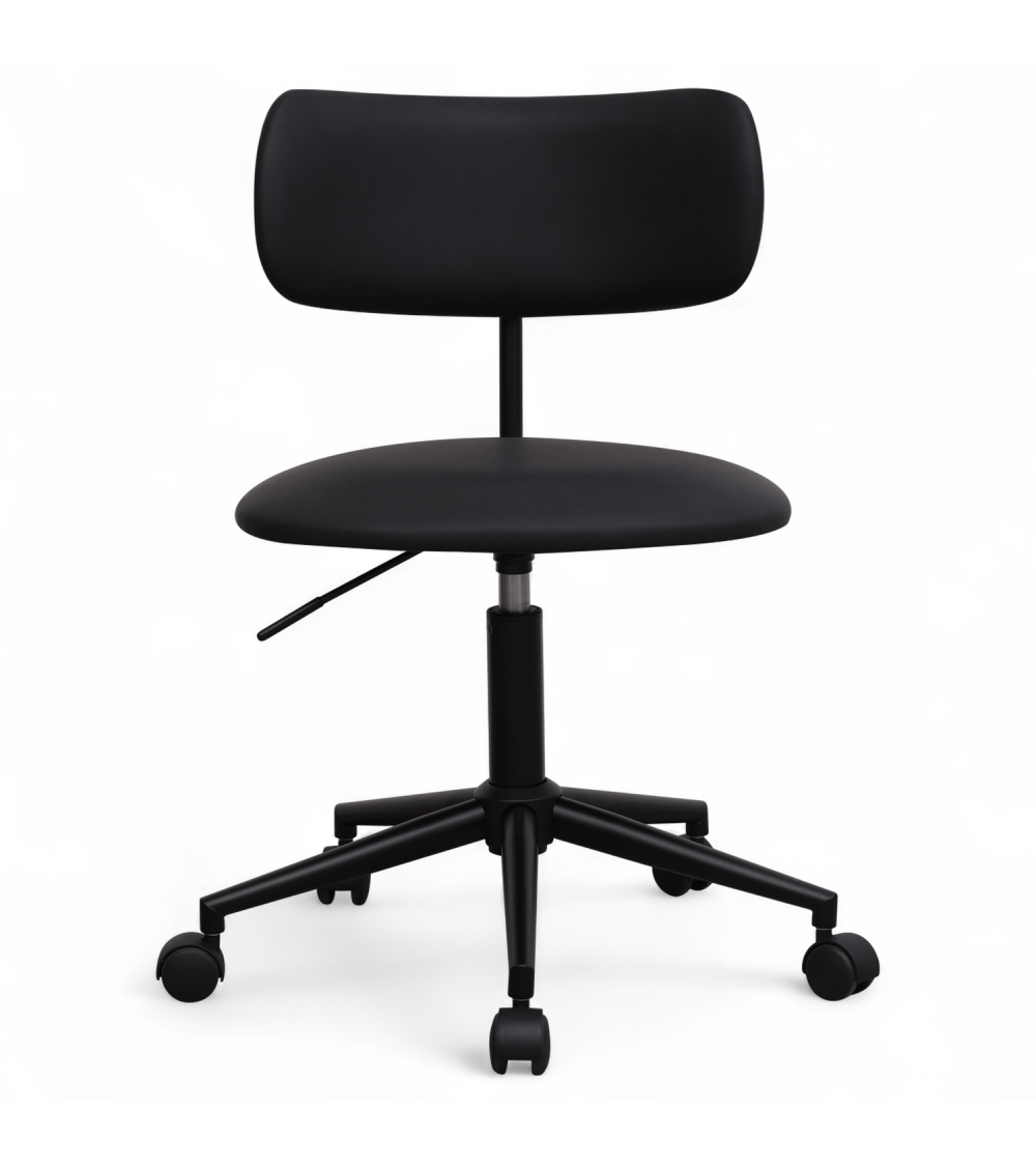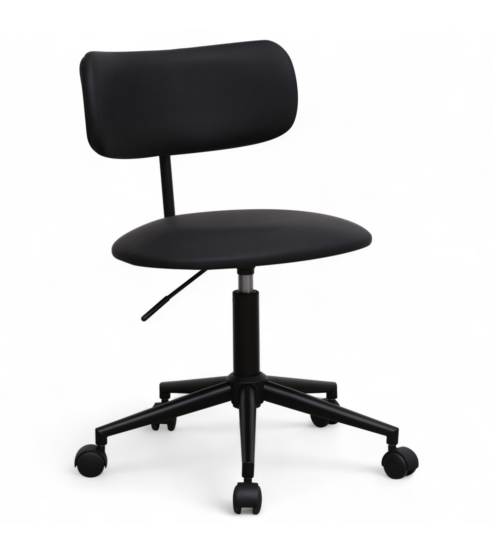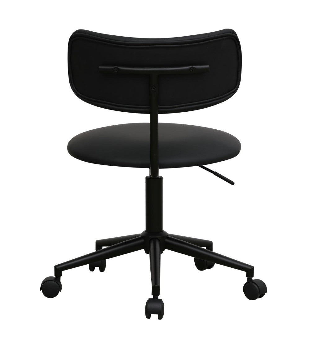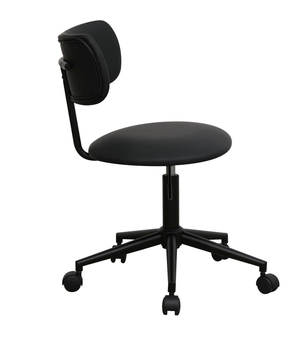 Stolen er polstret med sort kunstlæder og har behagelig skumpolstring i både sæde og ryglæn for ekstra komfort. Det sorte metalstel med drejefunktion giver 360° bevægelsesfrihed og mulighed for at justere højden fra 46 til 58 cm.