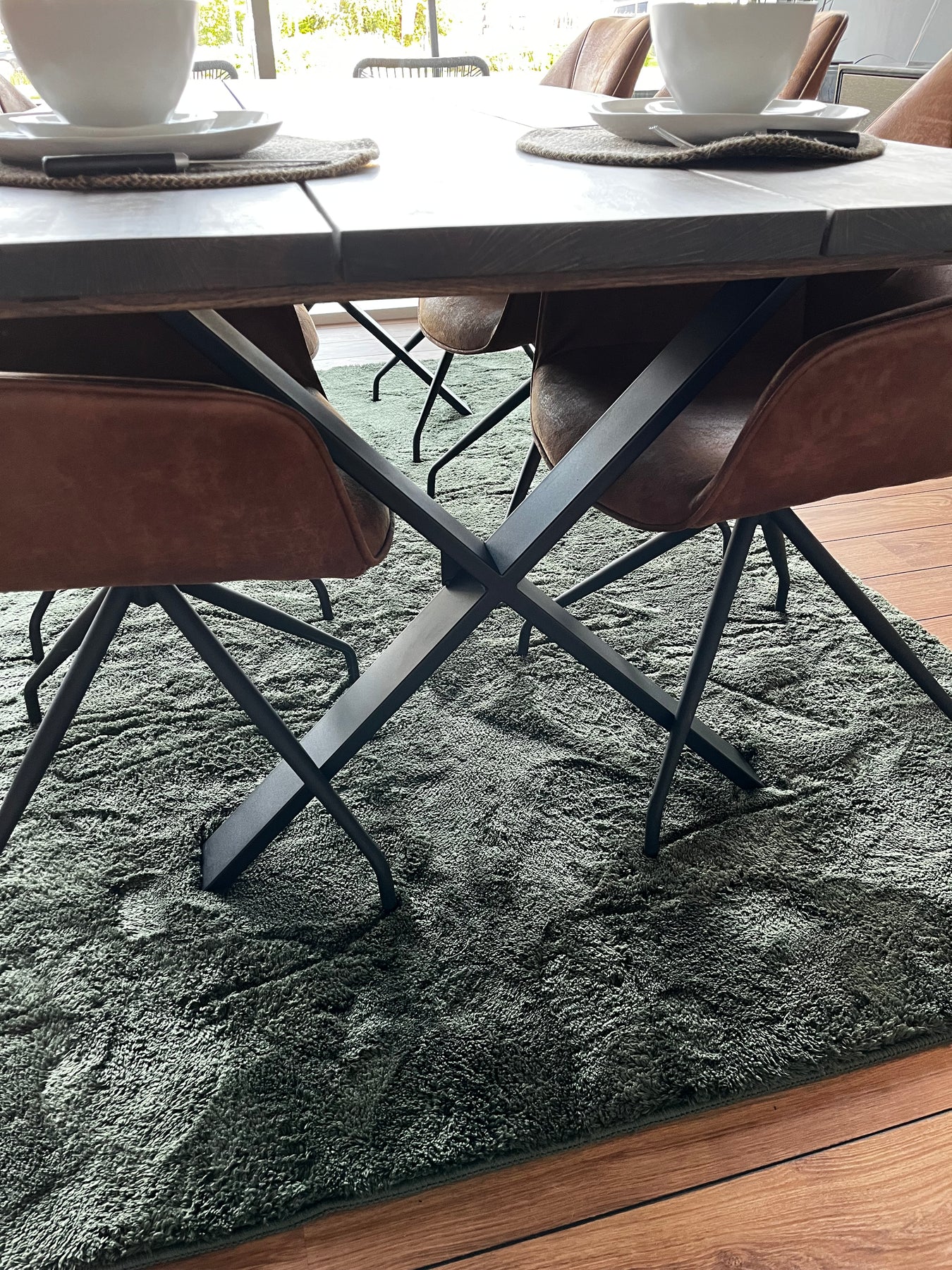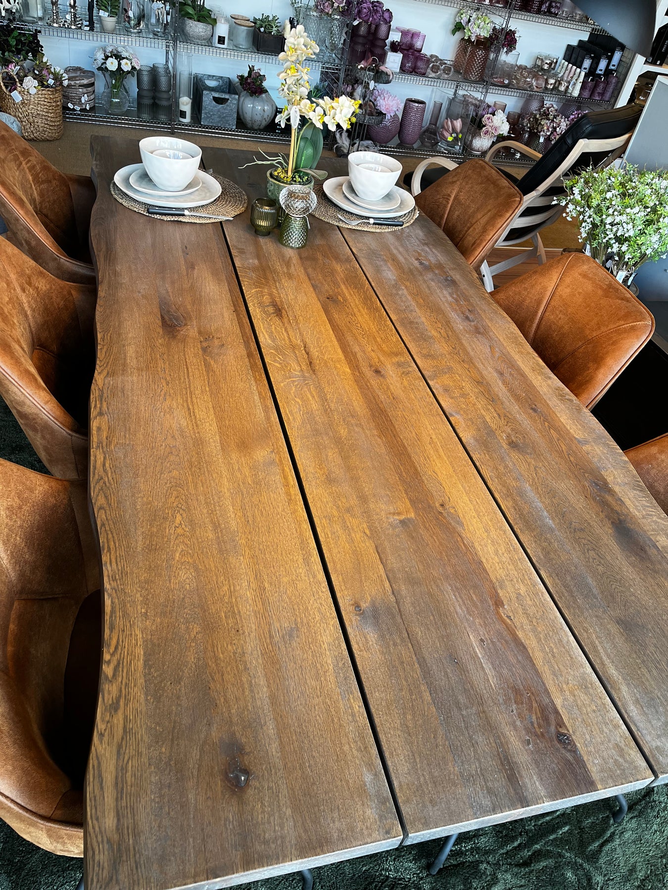 Bordet hviler på sorte metalben, som tilføjer et stilrent, industrielt præg og skaber en smuk kontrast til det varme træ. Et solidt og tidløst bord, der samler familien til både hverdag og fest.