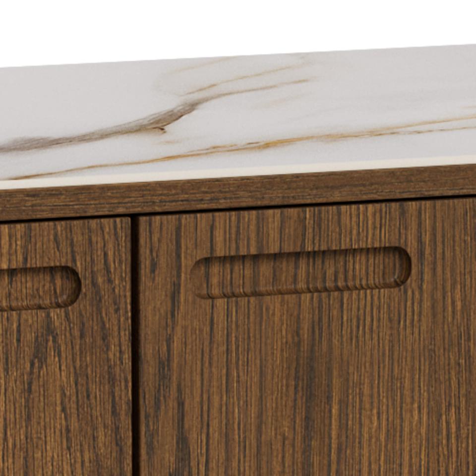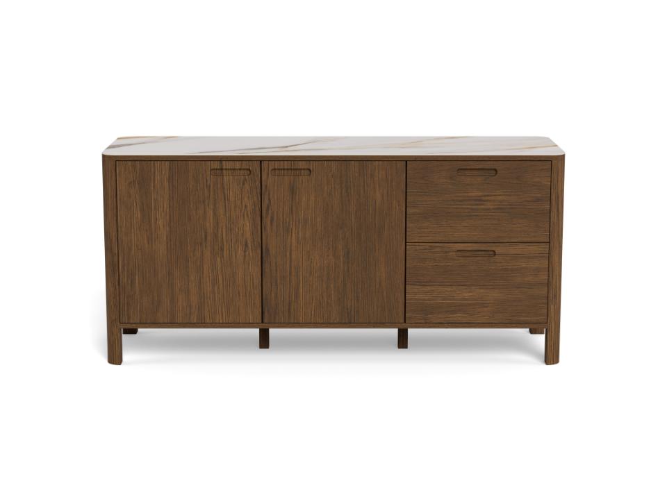 Southampton skænken kombinerer funktionalitet med et eksklusivt udtryk. Toppen er udført i cremefarvet, poleret keramik med organisk kant, der giver møblet et unikt og sofistikeret præg.